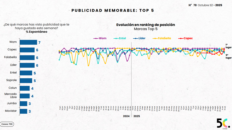 La marca Colun continúa siendo la más relevante para los chilenos con un (13%) de menciones espontáneas según la pregunta ¿cuál es la primera que viene a tu mente? Seguida por Líder (12%) y Soprole (10%). En términos de recordación publicitaria como publicidad memorable WOM lidera con un (7%) de menciones, manteniendo su posicionamiento como marca disruptiva y cercana. En medios, Mega se consolida como el canal informativo más seguido (28% en matinales y 25% en noticiero central), mientras que Radio Bío Bío destaca como la radio más elegida para informarse (38%).