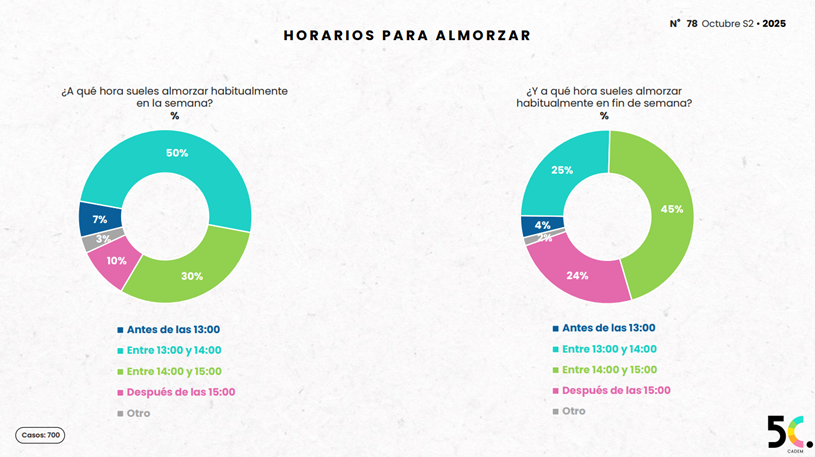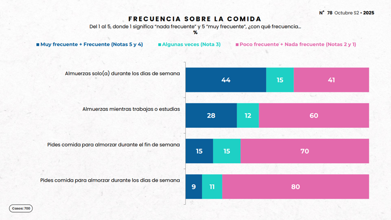 Las respuestas a la pregunta ¿Cuántos platos sueles consumir? Demuestran que el (58%) de los chilenos consume solo plato principal durante el almuerzo, mientras que un (22%) incluye entrada y plato principal. Por otro lado, respondiendo a la pregunta ¿Sueles acompañar tu almuerzo con algún bebestible? El acompañamiento más habitual es el agua (34%), seguido de la bebida (25%). Además, el (44%) declara comer solo durante la semana y el (41%) almuerza mientras trabaja o estudia. En cuanto a pedidos de comida a domicilio, el sushi es el favorito (31%), seguido de pizza y comida china (25% cada una). Los restaurantes casuales (48%) y de comida rápida (25%) son los preferidos para comer fuera de casa.
