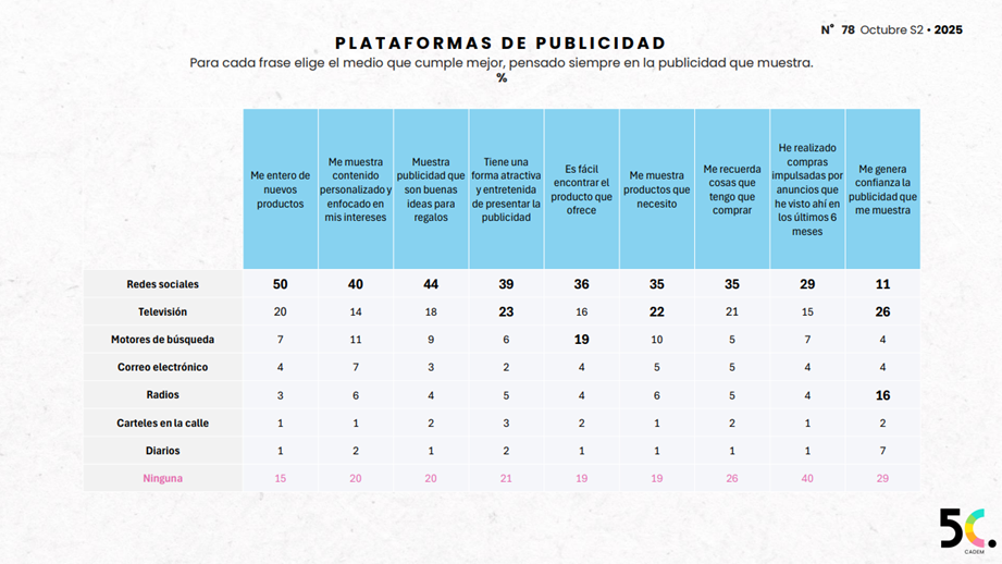 Las redes sociales concentran el (56%) del consumo publicitario, seguidas por televisión (47%) y correo electrónico (23%). Se perciben como el medio más efectivo para descubrir nuevos productos (58%) y contenido personalizado (40%). Por el contrario, la televisión mantiene la mayor confianza publicitaria (26%), especialmente por su capacidad de transmitir seguridad y credibilidad. El (29%) de los encuestados reconoce haber hecho compras impulsivas a partir de anuncios vistos en redes sociales. Esto quiere decir que dentro del consumo publicitario en redes la gente ve algo que le gusta o lo encuentra necesario o no y lo compra por impulso.
